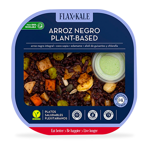 45% arròs negre integral, 9% allioli de pèsols (oli de gira-sol, beguda de soja [aigua, soia, xarop d'atzavara, alga Lithotamnium calcareum, alga Chondrus crispus], 10% pèsols, oli d'oliva, all, sal, 0,3% microalga Chlorella vulgaris), pastanaga, xampinyons, tomàquet, porros, 2% edamame (soja), 2% carn de coco jove, salsa de ssoja(aigua, soia, sal, vinagre d'alcohol), ceba, pebrot verd, aroma natural, anacards, pipes de carabassa, pipes de gira-sol, all negre, gírgolas, vi blanc (conté sulfits), alga kombu, alga hiziki, farigola, brou vegetal en pols (midó de blat de moro, miso [soja, arròs, aigua, sal, koji], hortalisses deshidratades (ceba, api, pastanaga, julivert], oli d'oliva, espècies), sucre integral, julivert, pebre negre, llorer.
