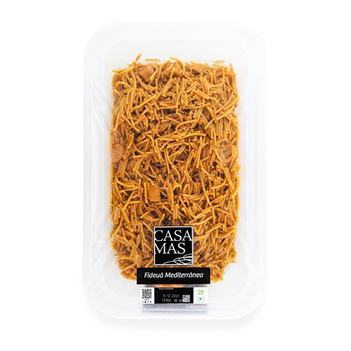Ingredientes: Agua, fideos (sémola de trigo duro), pata, cebolla, aceites vegetales (girasol y de oliva), gamba boreal, tomate concentrado, pimiento verde, pasta de ajo ajo, sal y antioxidante (ácido cítrico y ácido láctico), fumet de pez en polvo (tomate en polvo, sal, vegetales deshidratados (zanahoria, cebolla y puerro), aromas (contiene pez, crustraceos y moluscos), pez en polvo, extracto de levadura, gamba en polvo y especies), caldo de mejillón, crema de gamba (gamba cocida, sal, ggamba en polvo, extracto de levadura, caparazón de camarón en polvo, azúcar, agua, harina de arroz y colorante (extracto de pimienta roja)), fondo de pez (salsa de pez (extracto de anchoa, sal y azúcar), gamba, caparazón de camarón en polvo, maltodextrina de trigo, extracto de levadura, dextrosa de trigo, aromas, sal, mido modificado de patata y colorante (caramelo amónico)], sal, colorante (caramelo amónico), corrector de la acidez (lactato sódico) y conservador (sorbat potásico).